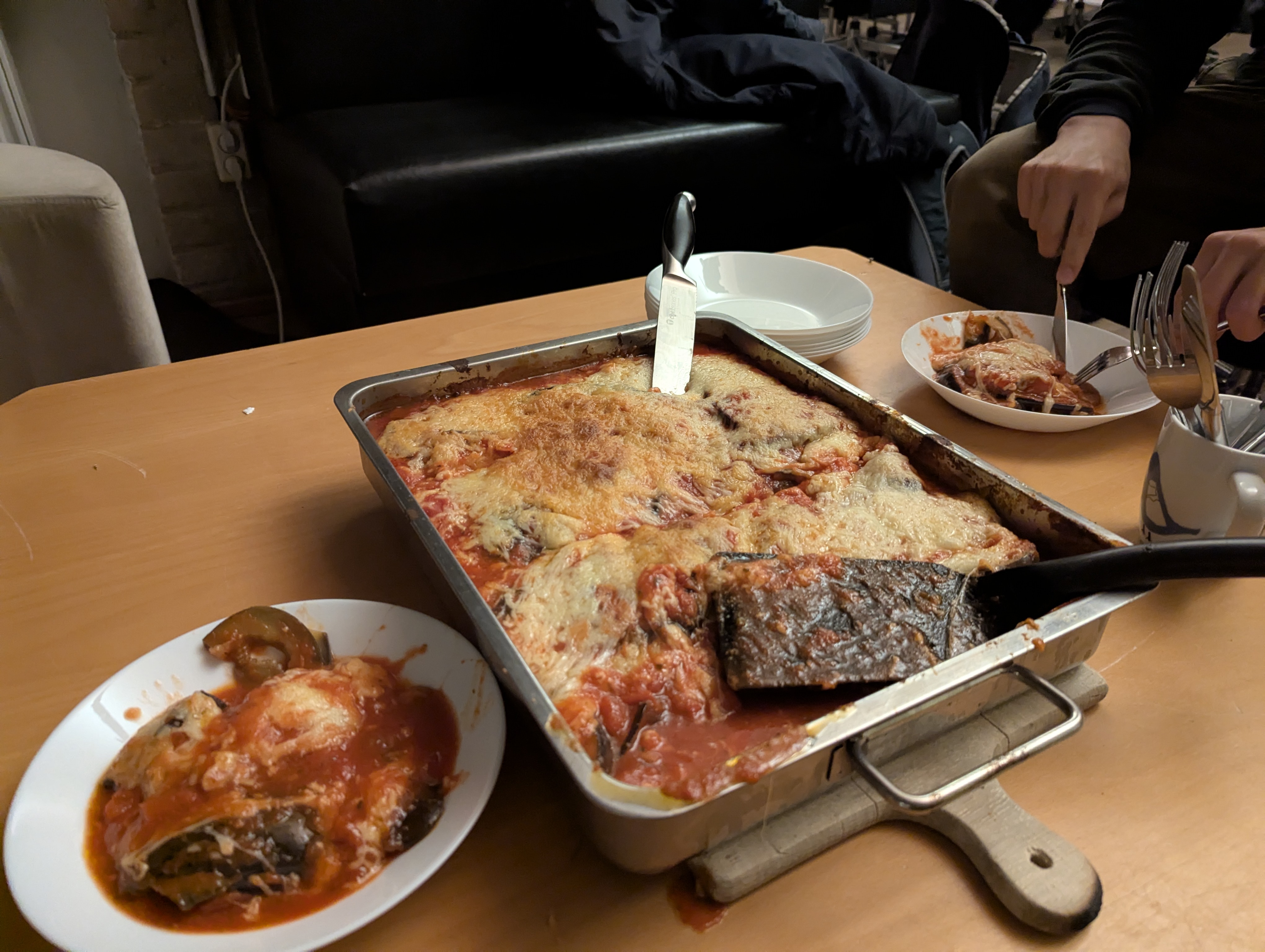 Eine Auflaufform mit Auberginenauflauf auf einem Tisch, auf dem sich ebenfalls verschiedene Teller mit dem Gericht befinden