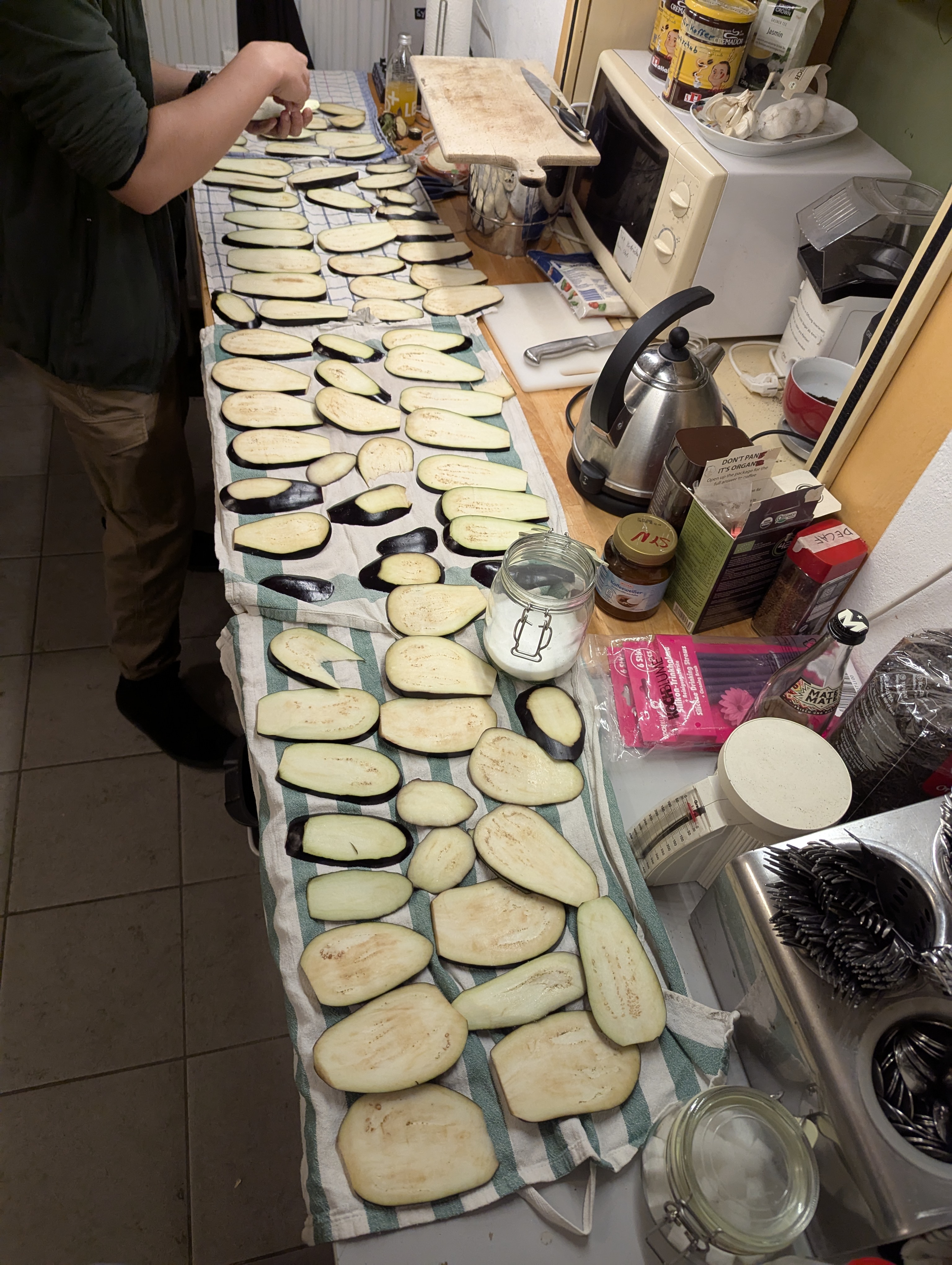 - Währenddessen Auberginen in Scheiben schneiden (1/4-1/2 cm dick), mit grobem Salz bestreuen und in einem Handtuch für 10–20 min ruhen lassen, sodass das Wasser entweicht