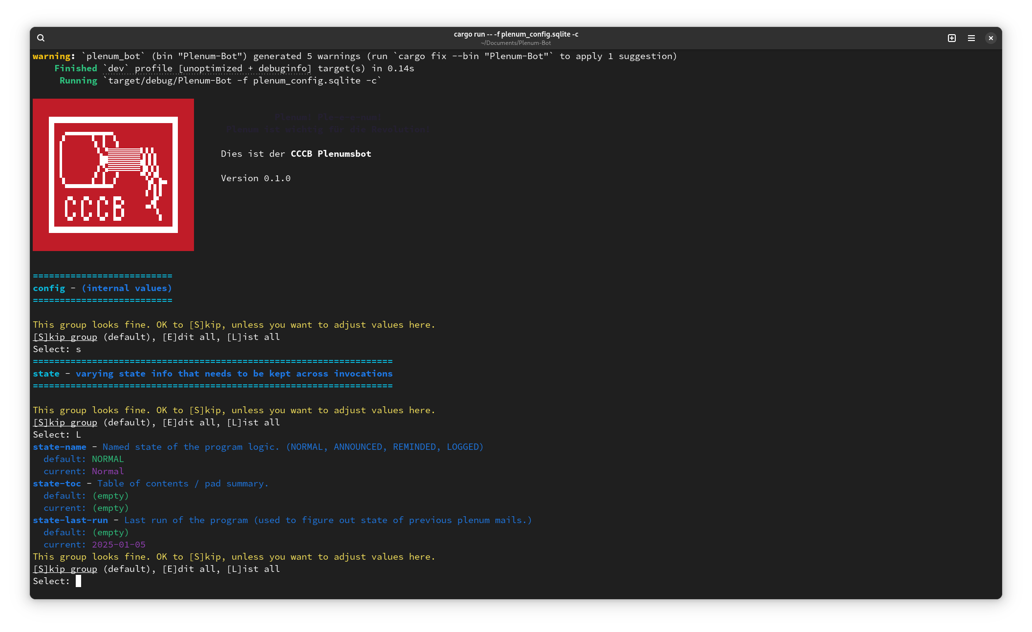 Wir wollten logischerweise keine Passwörter für E-Mail, MediaWiki und ähnlichem im Klartext im Code speichern. Das wäre deutlich zu unsicher und für immer in der Git History. Deshalb verwendeten wir die crate rusqlite, um einen Key-Value Store zu entwerfen. Der Key Value Store wurde in jeder der Dateien angelegt und es wurde definiert, welche Variablen verwendet werden sollten. Wir fügten verschiedene Arten von Config Feldern hinzu: