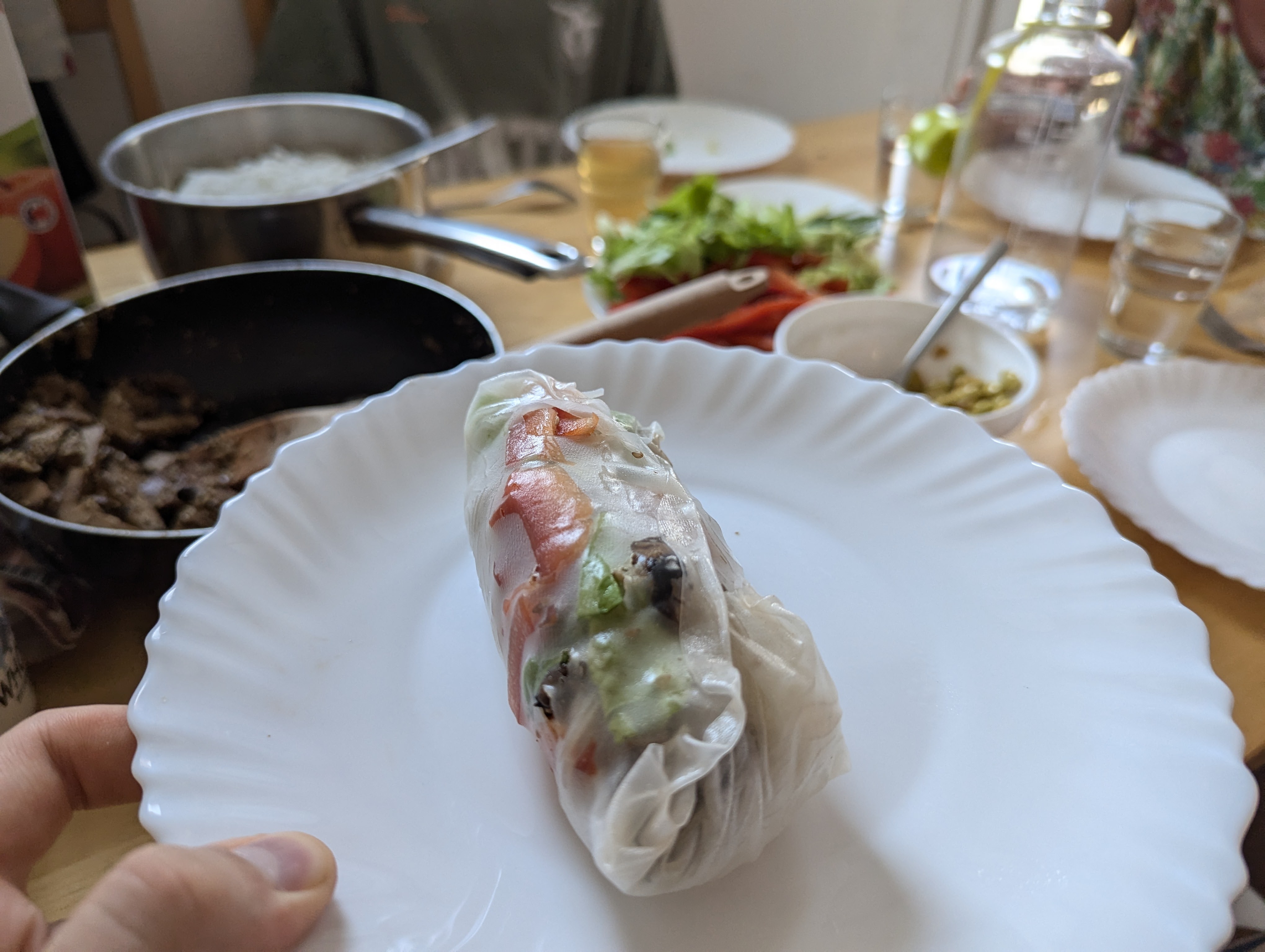 Als letztes heißes Wasser in einen großen, tiefen Teller geben und die Reispapierblätter für 30 Sekunden einweichen. Mit den anderen Zutaten befüllen und genießen.