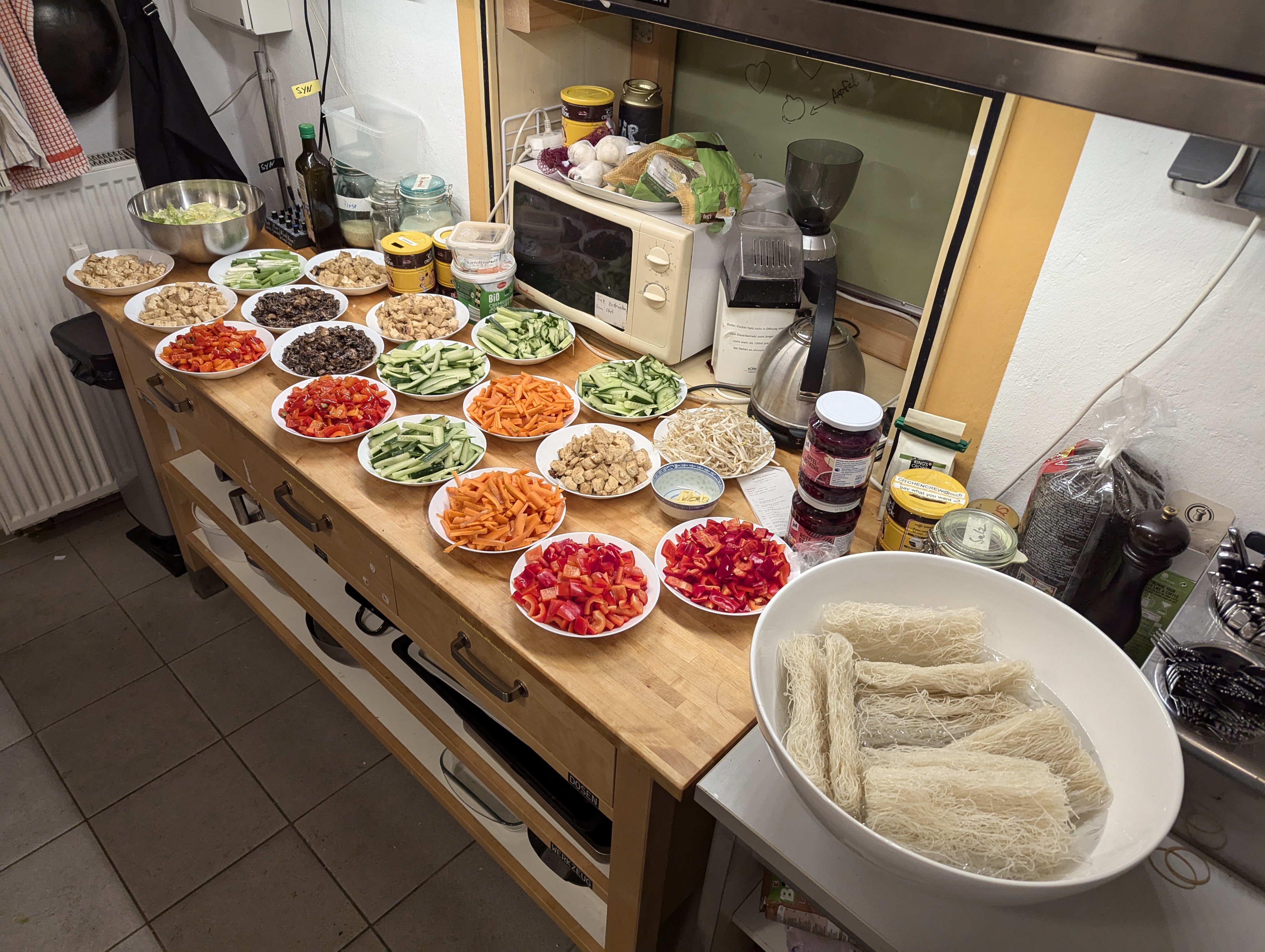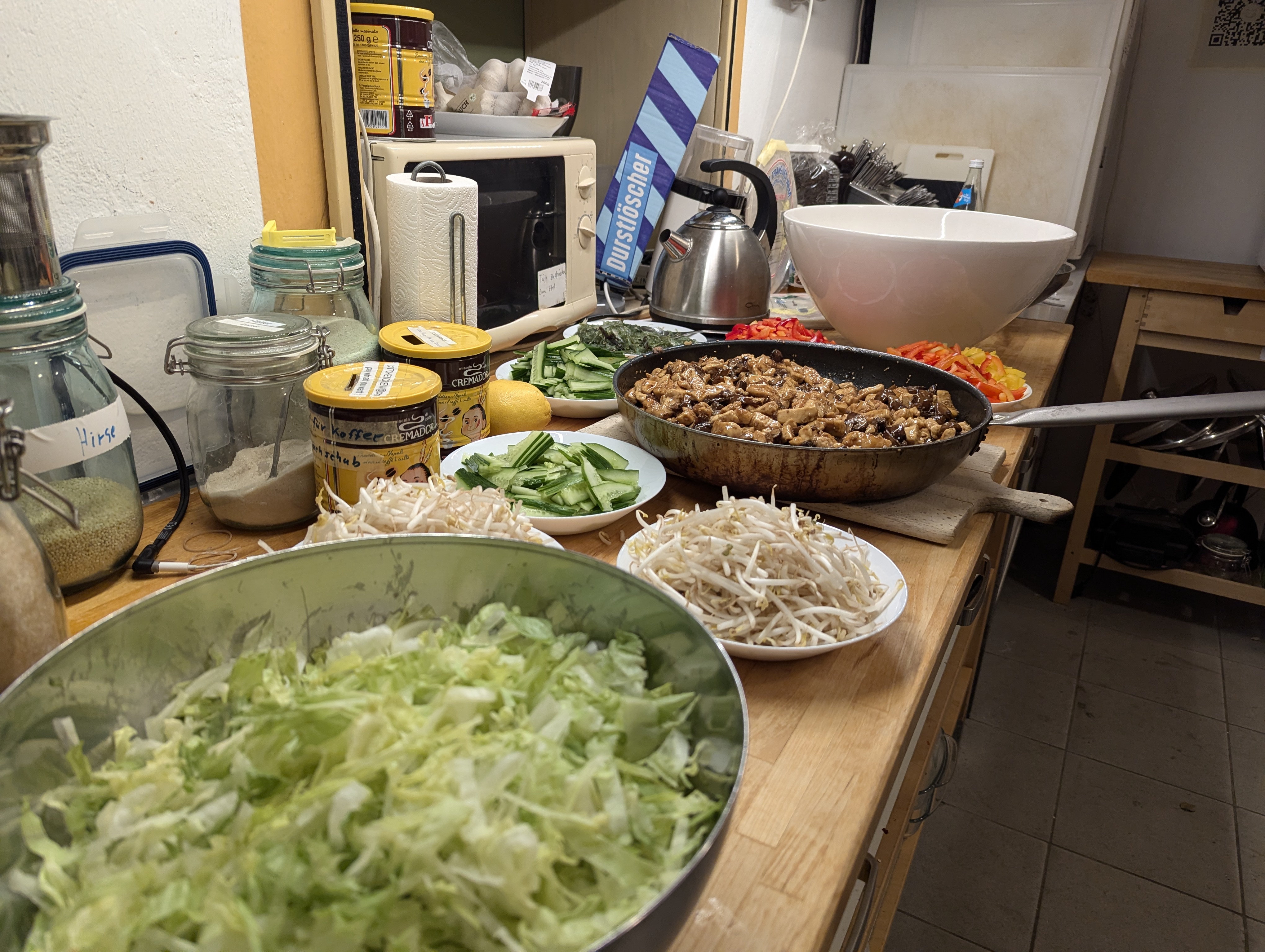 Den Eisbergsalat, Salatgurke und Paprika zu feinen Scheiben schneiden, in seperate Schüsseln packen und bereit stellen. Die Zutaten für die Sauce, bis auf die Stärke, in einer Schüssel vermengen. Tofu und Pilze schneiden und mit der Sauce in einer Pfanne anbraten. Nachdem Pilze und Tofu durch sind, die Pfanne runter stellen. Die Stärke mit etwas Wasser mischen und in die Pfanne geben. Die Glasnudeln mit heißem Wasser übergießen und für 4 min ziehen lassen. Danach abgießen und bereit stellen.